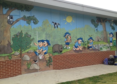Each mural is an original concept to suit the school environment such as having characters with the colours of the school uniforms.